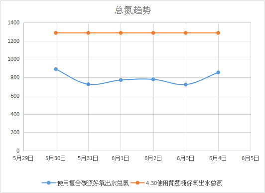 在生化系統厭氧池和缺氧池加入復合碳源101產品與菌種后,出水總氮持續下降,最終實現出水穩定達標,降低運行成本。