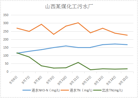 山西某煤化工污水處理廠系統(tǒng)設(shè)計(jì)1200m3/d,實(shí)際運(yùn)行處理400m3/d,調(diào)節(jié)池進(jìn)水總氮200-300mg/L,氨氮120-200mg/L,COD100-200mg/L。主體處理工藝為調(diào)節(jié)水池—氣浮池—缺氧池—三級(jí)好氧池—MBR膜池—排放,生化系統(tǒng)崩潰虧,出水總氮不達(dá)標(biāo),應(yīng)客戶要求降低總氮至25mg/L以下。