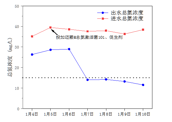 調(diào)試結(jié)果:邁葳®總氮激活菌101、促生劑顯著提升生化系統(tǒng)反硝化,出水總氮穩(wěn)定<15mg/L