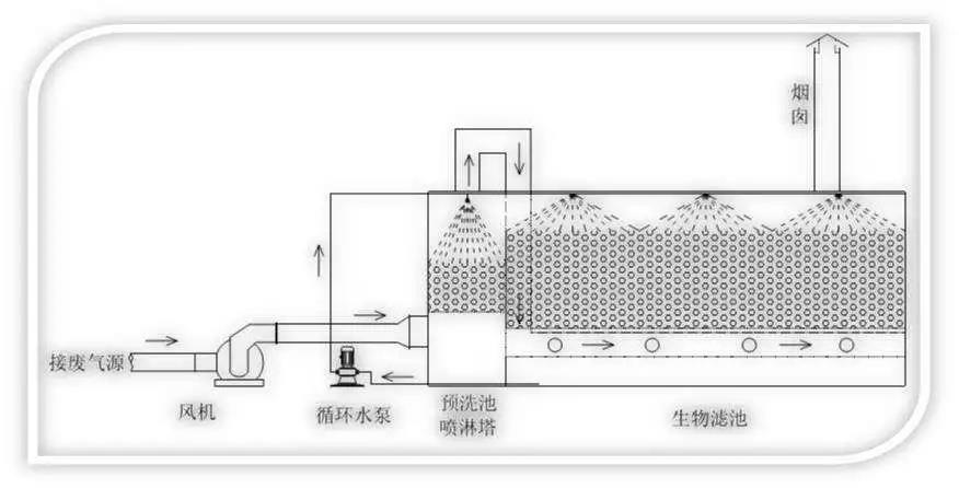 工藝流程:臭氣收集→風管輸送→抽風機→預洗池加濕→生物濾池吸收→生物氧化→無害氣體排放
