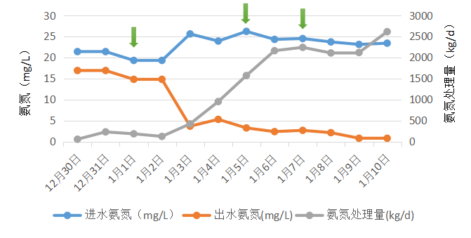 處理效果:菌劑投加4日后生化系統恢復正常,10天調試氨氮穩定達標,生化系統恢復運行。