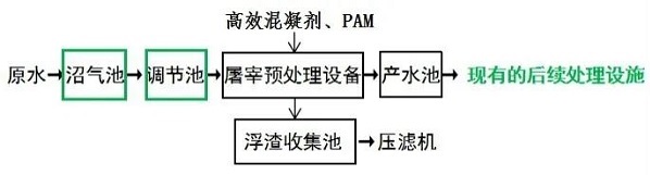 1.鑒于進(jìn)水COD濃度高于1000mg/L,且SS濃度高和氨氮波動(dòng)大等的特征,需要先采取物化預(yù)處理,降低水中COD、SS和動(dòng)植物油的含量。因此,增加了一臺(tái)高效屠宰廢水預(yù)處理設(shè)備,預(yù)處理后的產(chǎn)水再經(jīng)格柵流入生化工藝段,降低生化工藝段的處理負(fù)荷。