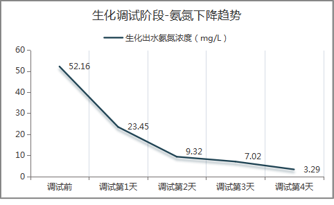 通過投加優(yōu)勢菌種,達(dá)到快速啟動(dòng)和提升系統(tǒng)處理能力的目的。菌劑投加三日后整個(gè)生化系統(tǒng)處理能力大幅度提升,COD、氨氮的去除率顯著提升,生化系統(tǒng)抗沖擊能力增強(qiáng)。生化處理對COD去除率可達(dá)到85%-95%,氨氮去除率95%以上。