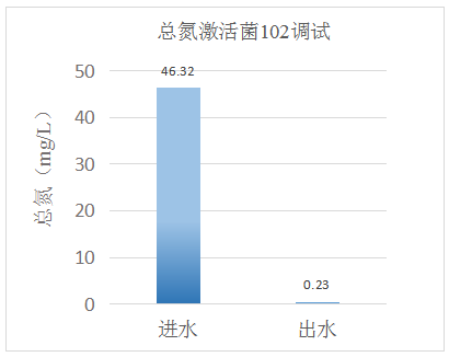 我司技術人員通過現場評估,發現生化系統總氮去除效率有限,生化溫度30℃,系統內有效生物量不足,導致系統抗沖擊能力差,出水總氮難以達標。通過技術人員現場投加復合碳源101和激活菌102,再配合現場生化系統運行條件控制、優化,達到如下效果: